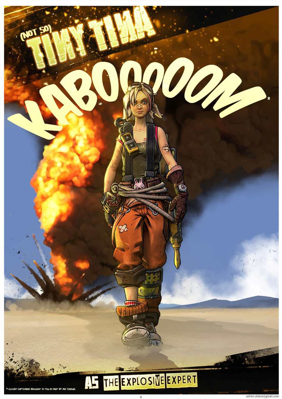 “This story happens 5 years after Borderlands 2 ending, and Tina is now 18. For those who don’t know her, she is the deadliest 13 year-old girl on Pandora and an expert in explosives. She’s now sponsored by Torgue who made her a custom harpoon gun that is connected to a winch that she’s wearing as a backpack. Whenever she wants something, it will get to her or she will get to it (depends on the size of the pray I guess).”